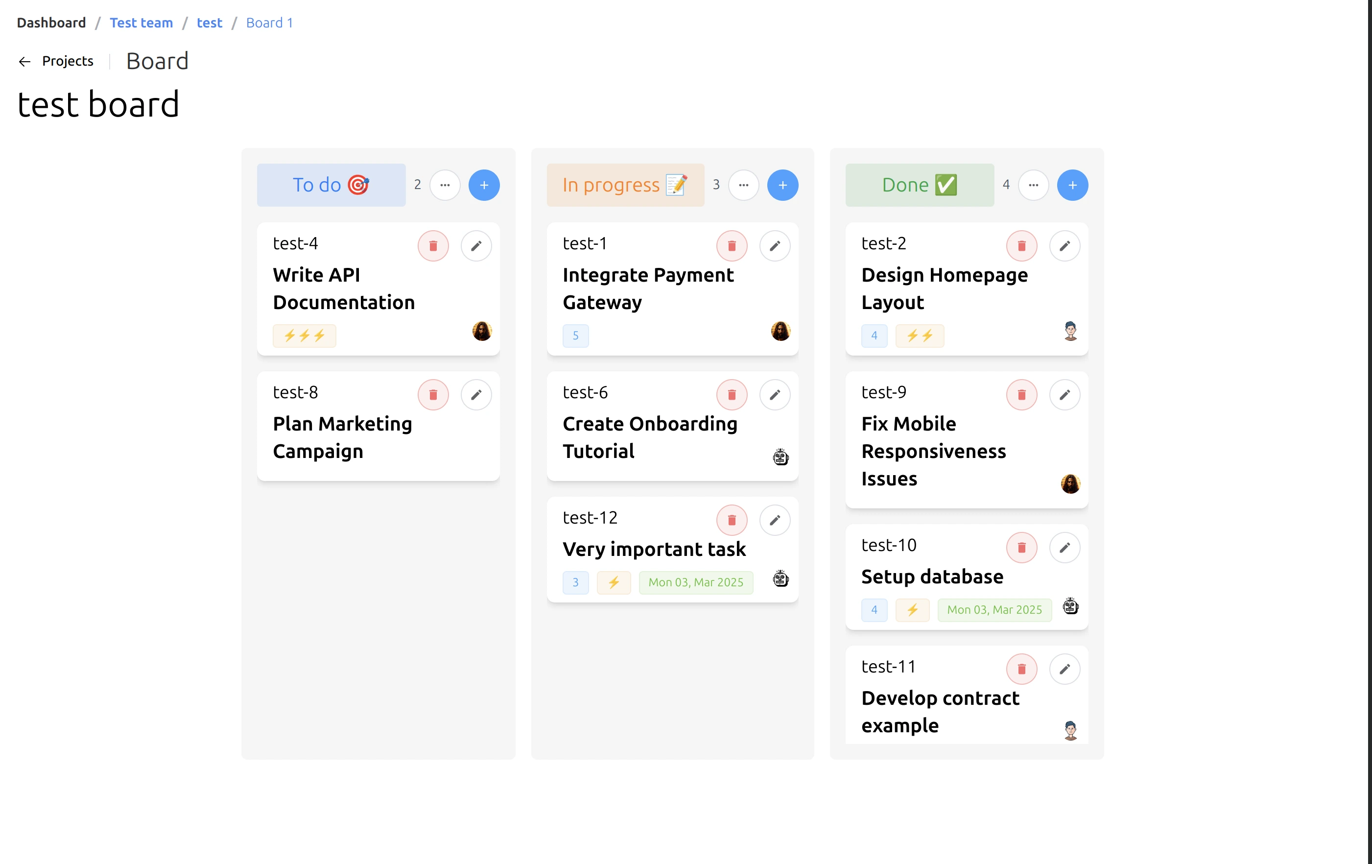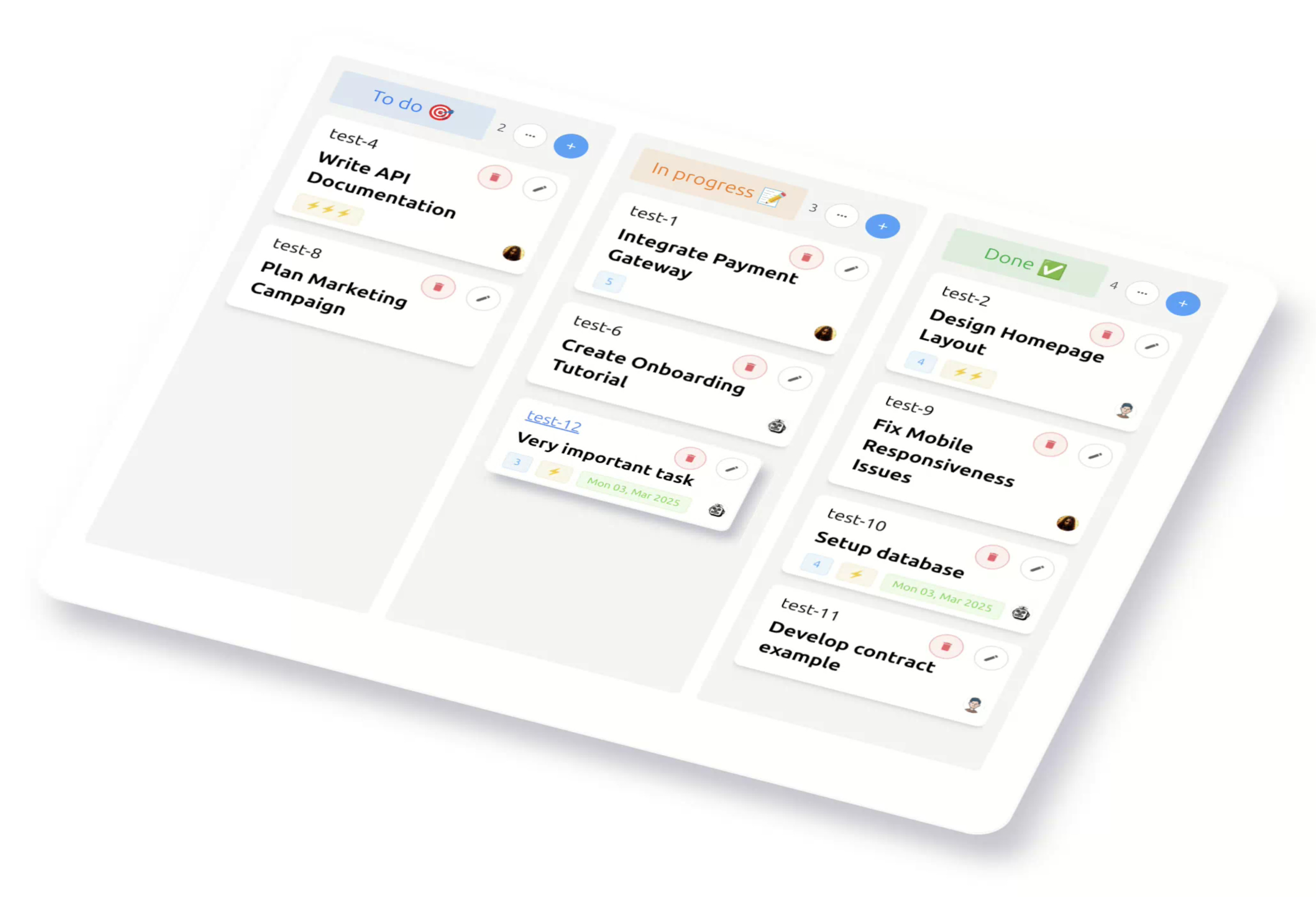- Создавайте, назначайте и отслеживайте задачи с подробными описаниями, сроками и уровнями приоритета.